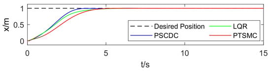 The simulation results in Figure 2 show that the PSCDC algorithm enables the cart to reach the desired position for the first time in 3.8 s and to move back and forth with small amplitude near the desired position; the LQR algorithm enables the cart to reach the desired position in 6.2 s; and the PTSMC algorithm proposed in this paper realizes the accurate positioning of the cart in the specified time of 6 s.