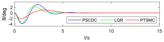 In this subsection, the simulations are compared and analyzed with the partially saturated coupled-dissipation control (PSCDC) algorithm proposed in the literature [27] and the linear quadratic regulation (LQR) algorithm proposed in the literature [28], through literature comparison simulations that verify the performance of the PTSMC algorithm designed in this paper.