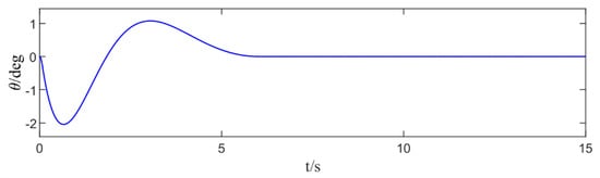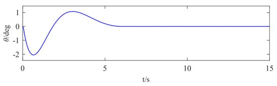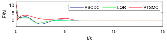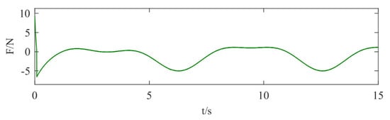 The results of the simulation experiment in Figure 14 show that the initial value of the control law is 9.28 N, and after 6 s the control law is still a varying curve due to the precise compensation of the disturbance in order to keep the control system stable, and the magnitude of the control law is opposite to the magnitude of the external time-varying disturbance after 6 s.