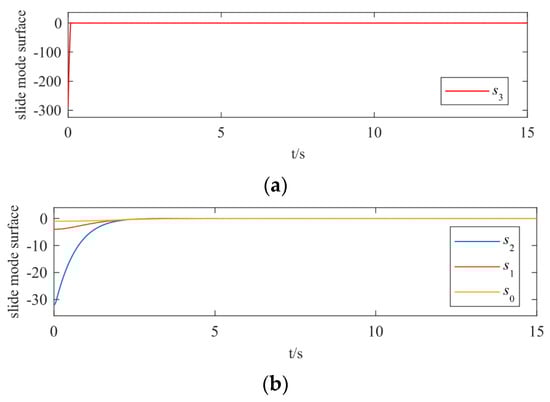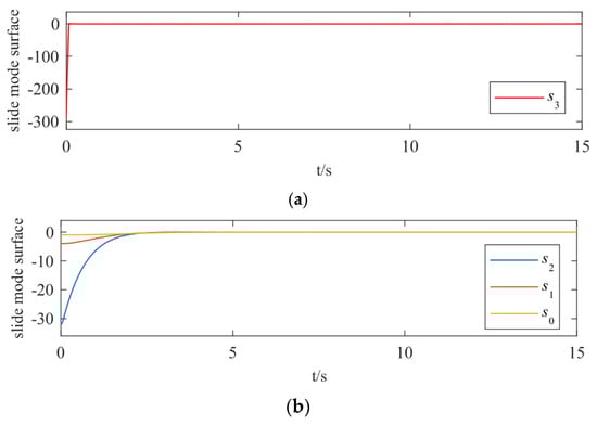 Trajectories of sliding mode surfaces at different levels over time. (a) The sliding surface convergence trajectory. (b) The sliding surfaces , , and convergence trajectories.
