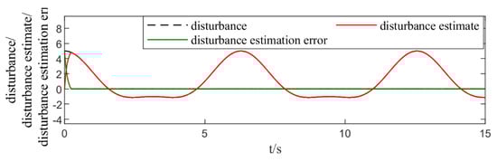 Trajectories of time-varying disturbance, disturbance estimate, and disturbance estimation error over time.