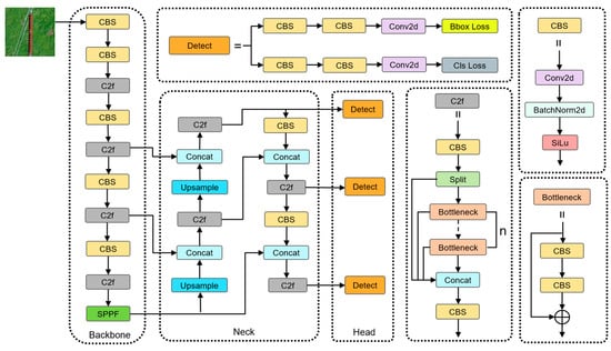 YOLOv8 is developed based on YOLOv5, incorporating different network depths and widths. It comes in five versions. Among them, YOLOv8n has the lowest amount of computation and parameter count, making it easier to deploy on embedded devices. Therefore, this study selects YOLOv8n as the baseline model for algorithm improvement. YOLOv8 is primarily composed of three components: the backbone, the neck, and the head, as shown in Figure 1.