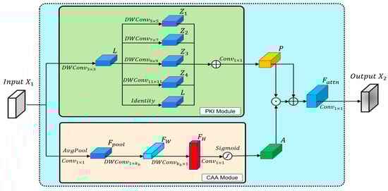 The PKI Block includes the PKI module and the CAA module. The PKI module uses 3 × 3 depth-wise convolutions to extract local information, and employs parallel depth-wise convolutional kernels of different sizes to extract multi-scale object features. The expression for the PKI module is as follows.