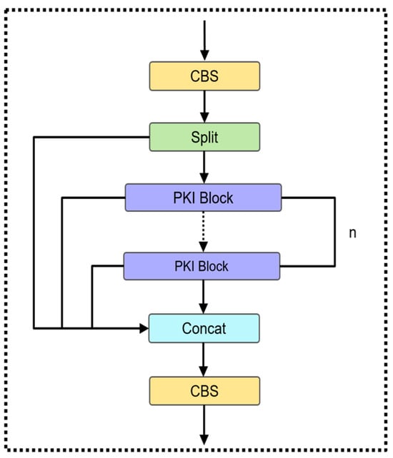 To enhance the detection accuracy of the model and reduce its parameter count, we replace the bottleneck modules in C2f with PKI Blocks. The improved C2f-PKI module is shown in Figure 4.
