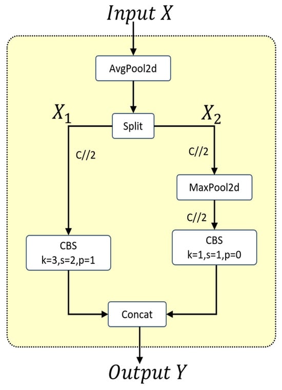 As shown in Figure 5, in the Adown downsampling module, the input feature map, X , first undergoes an average pooling operation. The feature map is then split along the channel dimension into two sub-feature maps: X 1 and X 2 . X 1 undergoes a 3 × 3 CBS operation, while X 2 is processed through a max pooling operation, then a 1 × 1 CBS operation. Finally, the two sub-feature maps are concatenated to produce the output feature map, Y , of the Adown module. The Adown module extracts rich feature information and fuses features from different scales to generate more representative feature maps.