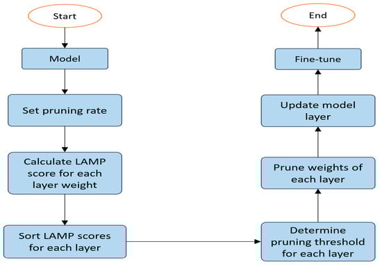 The LAMP uniform pruning process shown in Figure 6. First, input the improved model and the pruning rate. Next, flatten the weights of each layer and calculate their corresponding LAMP scores. Then, retain the weights with higher LAMP scores according to the pruning rate. Finally, update the model with the pruned weights.