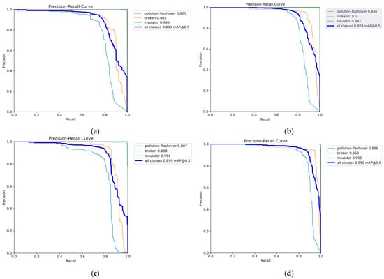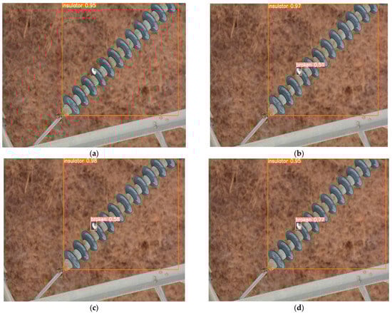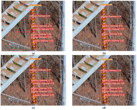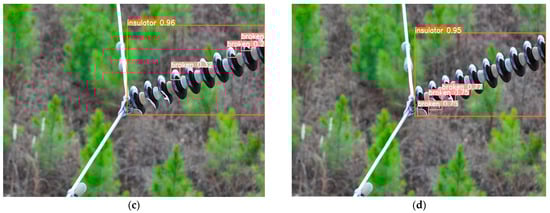 Figure 16. Comparison of defect detection results for special material insulators: (a) YOLOv8n detection results; (b) YOLOv9t detection results; (c) YOLOv10n detection results; (d) PAL-YOLOv8 detection results.