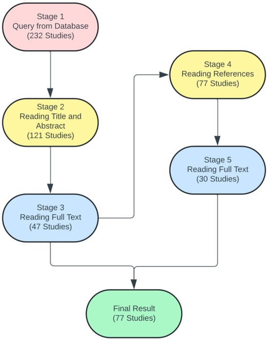 Our research collection process began by querying the databases, which resulted in 232 studies. The titles and abstracts were then read and narrowed to 121 studies. A thorough review of the full text of these studies reduced the sample size to 47. By examining the references of the selected studies, we identified 77 more studies that seemed to be highly related to this review. After reading their full texts, we included an additional 30 studies in our final list. This rigorous process led to the final selection of 77 studies for a detailed analysis.