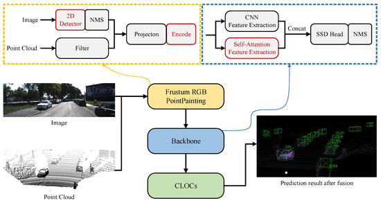 (3) Late fusion: The 2D candidate box generated in step (1) and the 3D candidate box generated in step (2) are encoded into two sets of sparse tensors before non-maximum suppression (NMS) and input into the camera–LiDAR object candidates fusion network (CLOCs) to obtain the final detection results.