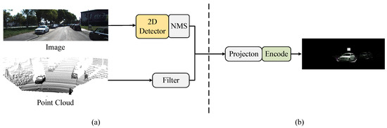 (a) Two-dimensional object detection using a relatively mature 2D detector and generating frustums after passing through NMS. (b) Regional data-level fusion projecting the spatial point cloud to the image, painting the point cloud in the frustum, sequentially encoding the point cloud in the local area, and adding a recommended channel and three color channels. The recommended channel is a two-dimensional Gaussian probability function mask, and the color channel is RGB information corresponding to the image pixel.