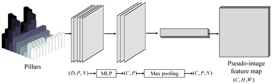 As Figure 5 shows, PointPillars will divide the input point cloud for representation, then distribute grids of size 0.16 m × 0.16 m uniformly and continuously in the grid in the plane to form a set of “pillars”. At the same time, the 8-dimensional point cloud encoded by FRP in the early fusion will be enhanced and represented as 13-dimensional , where x, y, and z are the position coordinates of the raw point cloud, r is the reflectivity, , , and are the arithmetic mean centers of all the points in the “Pillars”, , represent the offset of the arithmetic center from the center of the “pillars”, S is the recommended channel, and R, G, and B represent the color channels corresponding to the point cloud. By limiting the number P of non-empty “pillars” of each sample and the number of points N in each “pillar“, the sparsity is maintained from 0 to 97%. If the amount of data in the “pillars” is large, random sampling will be performed. On the contrary, if the amount is too small, it will be filled with “0”. Therefore, a tensor of size is established, where D represents the feature dimension of each point cloud, which is 13 after FRP encoding (the original PointPillar is 9), P represents all non-empty pillars, and N represents the maximum number of point clouds in each pillar. Then, a simplified end-to-end network PointNet is used to further process and extract features from the tensorized point cloud data. It applies the data of each pillar into a linear layer for dimension-up operation and generates a tensor with the size of through the BatchNorm layer and ReLU layer. Then, it obtains a tensor with the size of after performing max pooling on the channel. Finally, the encoded features are piled up according to the position of the original pillar and scattered back to the original “pillar” position, creating a pseudo-image feature map with the size of , where is the number of channels, and H and W represent the height and width of the pseudo-image.