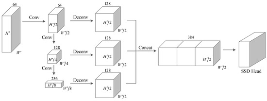 A CNN backbone network similar to FPN is used for spatial feature extraction, as shown in Figure 6. The network is divided into a downsampling connection network and an upsampling connection network. In total, three layers of convolution operations are performed to complete the multi-scale feature extraction and channel splicing fusion. The downsampling network extracts more abstract and high-level pseudo-image features through convolution while reducing the spatial resolution. The upsampling network keeps the feature image size aligned with the original pseudo image through deconvolution.