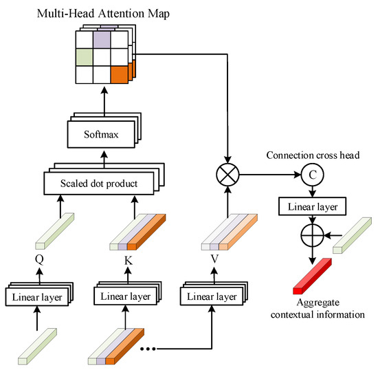 As Figure 7 shows, based on the global self-attention mechanism module, the processed feature map is mapped to the query vector Q, key vector K, and value vector V through the linear layer, where V represents the input feature, and K and Q are used to compute the importance of the feature in the attention map. We calculate the similarity dot product between query element and each key to obtain the weight: