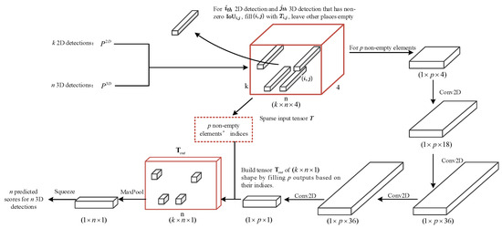 In the formula, is expressed as the intersection-over-union, which is calculated from the i-th 2D candidate result and the j-th 3D candidate result, which is the concentrated expression of geometric consistency. is the confidence of the corresponding box, is the confidence of the corresponding box, and denotes the normalized distance from the j-th 3D candidate bounding box to the ground . This representation can easily eliminate tensors with low values to reduce false alarms. T is processed by four convolution layers to produce a tensor of size . Then, a tensor of size is constructed by filling p output elements with reference to the position index of the input tensor. Finally, by max-pooling the first dimension of the tensor to map it with the expected target of the probability score of , the final fusion result will be selected.