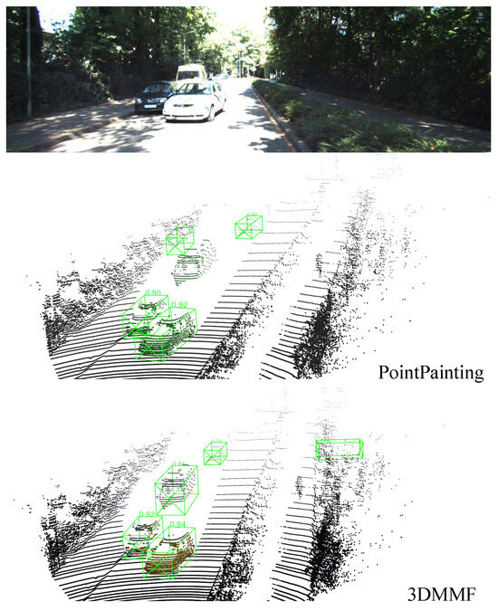 We evaluate the performance of our method, the LiDAR-only method, and the single-stage fusion method on the KITTI dataset. Table 1 shows that 3DMMF has a better performance on the car class in all three difficulty indicators compared with the single-stage fusion method MV3D, F-PointNet, AVOD, PI-RCNN, and F-ConvNet, performing best in the easy and difficult levels. As shown in Figure 9, the detection frames generated by PointPillars after encoding using the original PointPainting method and our method are compared under the 3D point cloud scene and the corresponding image, respectively. It can be seen intuitively that the prediction confidence in PointPainting is improved in 3DMMF. Compared with the LiDAR-only method, it also has certain advantages, especially compared with the baseline method PointPillars. Our method greatly improved all the indicators, and the average mAP increased by 6.3%.