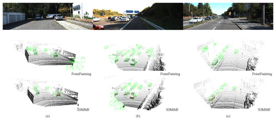 The effects obtained by PointPainting and 3DMMF in the figure: (a,b) In PointPainting, a object false alarm of the car obviously appears on the left and near the LiDAR. (c) In PointPainting, there are false alarms, missing alarms, and objects in the wrong direction.