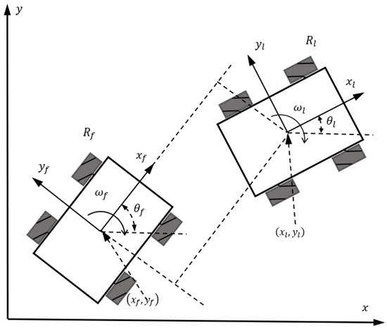 A group of leader–follower formation configurations is illustrated in Figure 2, where is the follower robot and is the leader robot. Both robots are omnidirectional mobile robots with mecanum wheels, and they move in the same plane. The kinematics of each robot can be represented by Equation (1).