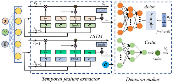 The network structure of the adaptive distributed recurrent SAC formation framework consists of two parts, namely a temporal feature extractor and a decision maker, as illustrated in Figure 3.