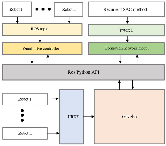 To enable interaction between the robot and the reinforcement learning environment, we first design the URDF model of robots and the environment model. Then, we use the Python API to achieve interaction between multi-robot systems and the environment. Finally, PyTorch is used to construct the recurrent SAC leader–follower formation network and reinforcement learning algorithm. The details of the configuration are shown in Figure 4.