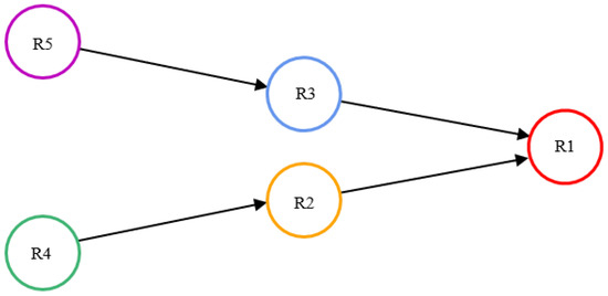 Five robots are used for the V-shaped formation evaluation. In this configuration, R1 acts as the leader for R2 and R3, while R4 and R5 are followers of R2 and R3, respectively, as illustrated in Figure 5. The desired distances and angles are set as follows: and .
