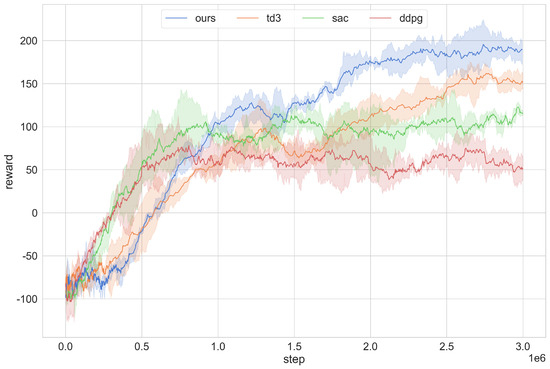 We trained the follower agents using DDPG, TD3, pure SAC, and our proposed algorithms. The training results, as shown in Figure 6, clearly demonstrate that our method performed the best in the mobile robot formation training process. Our method not only converged to a higher reward value but also exhibited less fluctuation during training, showcasing better stability.