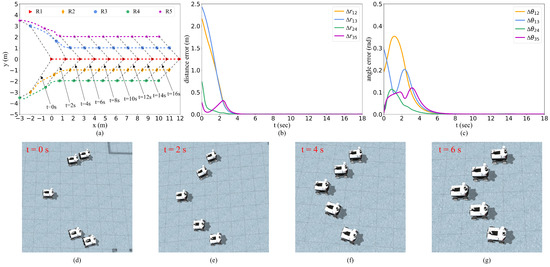 The V-shaped formation results. (a) Trajectories of all robots on a plane; (b,c) relative distances and angles between leader and follower robots, respectively; (d–g) snapshots of robots at t = 0 s, t = 2 s, t = 4 s, and t = 6 s, respectively.