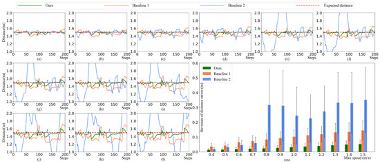 The formation results concerning the distance from random motions. Baseline1 is the common network controller without LSTM; Baseline2 is the PID controller. (a–l) Distance curves when the leader is set to maximum speeds of 0.4 m/s, 0.5 m/s, …, and 1.5 m/s, respectively. (m) The means and standard deviations of distance errors.