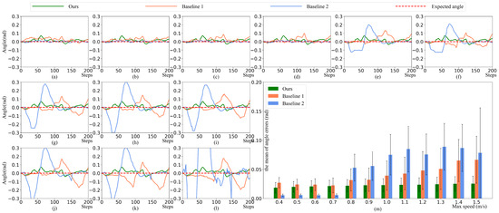 The formation results concerning the angle of random motions. Baseline1 is the common network controller without LSTM; Baseline2 is the PID controller. (a–l) Angle curves when the leader is set to maximum speeds of 0.4 m/s, 0.5 m/s, …, and m/s, respectively. (m) The means and standard deviations of angle errors.