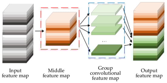 Unlike conventional convolution, a Ghost module first performs conventional convolution on the input feature map and sets the output channel number to half of the original channel number; that is, if the number of channels of the original output feature graph is N, then the number of channels of the middle feature graph in the left dashed box in Figure 3 is N/2. Next, linear operations are performed on the middle feature map on the left dashed box to generate more Ghost feature maps. Finally, the grouped convolution results inside the dashed box on the right are concatenated with the middle feature map, which reduces the model’s parameter and computational complexity while leaving the number of channels and resolution of the input and output feature maps unchanged.