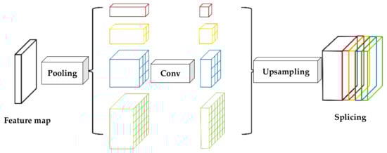 The PPM module first generates four feature maps with different sizes by pooling the input feature maps. The top red layer represents the coarsest pooling level, which is global pooling. The remaining three levels evenly divide the input feature maps into several subregions with different sizes. In Figure 4, the yellow layer is 2 × 2, the blue layer is 3 × 3, and the green layer is 6 × 6. Then, a 1 × 1 convolution is performed to reduce the dimension of the four different feature maps after each pyramid level. For example, if the original feature layer level dimension is n, the dimension of the reduced feature maps is . Then, bilinear interpolation is used to upsample the low-dimensional feature map directly to obtain a feature map of the same size as the original feature map. Finally, different levels of features are concatenated as the final pyramid pooling global feature.