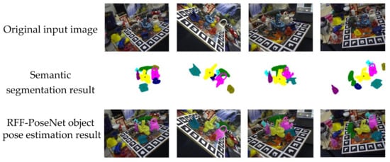 The visualization results of RFF-PoseNet on the Occlusion LineMOD dataset are shown in Figure 8. The first row is the original input image, the second row is the result calculated by our method in the semantic segmentation branch, and the last row is the final result of pose estimation. It can be seen from Figure 8 that the RFF-PoseNet network has a certain degree of accuracy in pose estimation, and can also complete the task well when dealing with complex backgrounds and occlusion, thus achieving a relatively accurate 6D object pose estimation result.