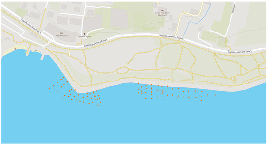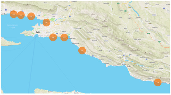 The photos were taken in the coastal area of the Adriatic Sea in Split-Dalmatia County. Twenty-three locations (stations) are located in the coastal area of the following cities: Kaštela, Vranjic, Split, Stobreč, Podstrana, and Lokva Rogoznica, as shown in Table 1, Figure 1 and zoomed in Figure 2.