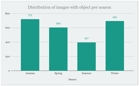 Data collection was conducted through all four seasons from December 2021 until March 2023. During the winter, three trips to the field were made, five trips were made during the spring, eight during the summer, and fourteen during the fall, so image distribution was kept similar per season, as shown in Figure 3.