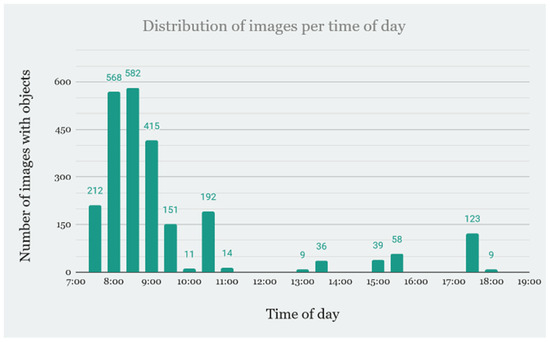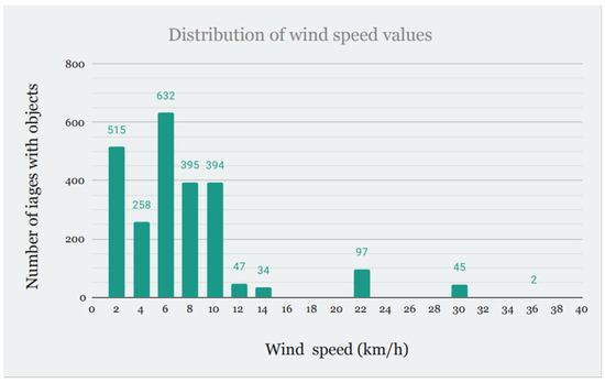 As shown in Figure 4, the earliest time for photography was at 7:10, and the latest was at 18:30, while the wind speed ranged from 0 km/h to 35 km/h. The number of images present in a specified bucket (by time of the day or by wind speed) is shown in Figure 4 and Figure 5.