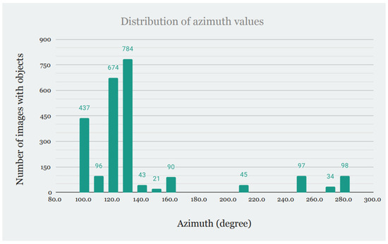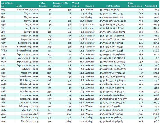 The database consists of 5405 original images. Of those 5405 images, there are 2419 images, 44.8% of which have underwater litter present, while the rest, 55.2%, do not. In addition to the date of photography, location, GPS coordinates, wind speed, type of wind, and season, the angle of solar elevation and azimuth were calculated. Each station is assigned a unique prefix and serial image number, as shown in Figure 12.