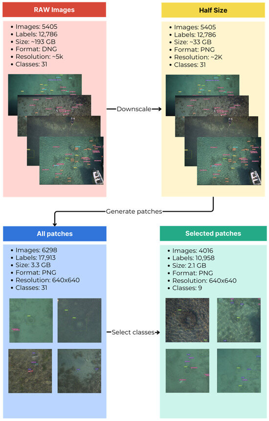 Processing RAW images demands significant computational resources. Therefore, all images were downscaled by a factor of two in both horizontal and vertical resolution and subsequently converted to PNG format. This modified dataset is referred to as the Half Size database. Also, most deep neural networks require smaller images than those in RAW or half-size databases. Resizing again was not a feasible option since the images contained small objects, and resizing would reduce these objects to a few pixels. Therefore, a patch database was created from the halved one, as shown in Figure 8. This database is referred to as the All Patches database. Parts of the images showing the objects were cut out into patches, i.e., a part of the image where labeled objects are located. The patches have dimensions of 640 × 640 pixels and contain one or more objects that are fully or partially visible. This database has 6298 images that are smaller and easier to work with. Since the classes are imbalanced, 9 classes were selected to train with, covering most of the litter found on the seafloor, as shown. These classes were extracted from the All Patches database (summary data presented in Figure 8 and class distribution presented in Figure 9) to create a final Selected Patches database used for preprocessing and training the models. The selected Patches database, shown in Figure 10, consists of 4016 images of 640 × 640 pixels containing the classes: Fragments, Construction material, Tires, Cans, Bottles, Cloth, Bags, Caps and lids, and Cups as shown in Figure 11.