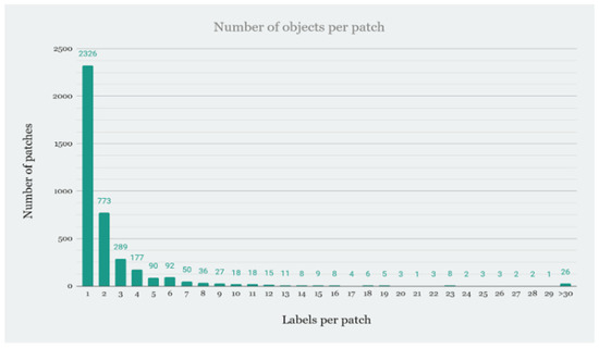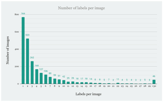 Many images have multiple different objects present at the same time, so the distribution of objects per image is also shown in Figure 14. It can be seen that most of the images have one or two objects present, but there are images with more than 30 objects present.