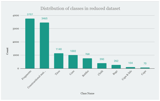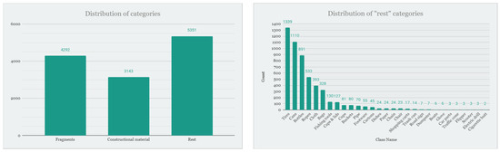 The database consists of 12,786 objects classified into 31 classes: Fragments, Constructional material, Tires, Cans, Bottles, Ropes, Cloth, Bags, Fishing tools, Caps, and lids, Cups, Buckets, Pipe, Footwear, Cartons, Dishes, Paper, Chain, Chair, Shopping carts, Trash can, Road sign, Dumpster, Boats, Glove, Car parts, Traffic cone, Flipper, Scooter, Electric drill and Cigarette butt as shown in Figure 13.