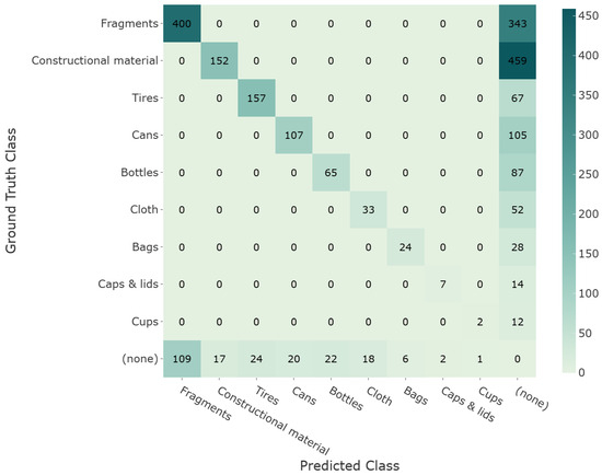 As shown in the confusion matrix in Figure 16, the highest values are concentrated along the diagonal of the matrix, indicating that the model has correctly classified instances for each category, which suggests an effective model. The confusion matrix indicates that the model performs very well in identifying fragments. However, there are instances where Fragments or Construction materials were not identified at all (visible in the (none) column). The concentration of positive values along the diagonal and zero values off-diagonal suggests that the model performs well but has issues with missing detections.