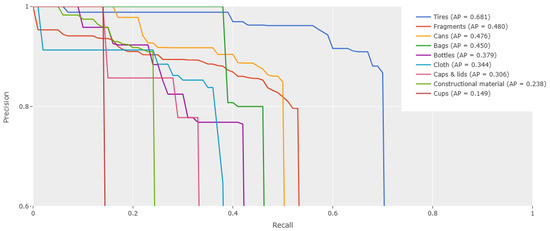Figure 17 plots the Precision-Recall curve with IoU@0.5 and shows a single number summary of the PR-Curve (representing the area under the curve, AP). Tires exhibit the highest average precision, indicating that models can distinguish tires from other categories effectively. Fragments and Cans show moderate performance. Bags, Bottles, and other categories show lower AP. This can be attributed to the amorphous and semi-transparent structure, which makes it difficult for models to extract object shapes and features.