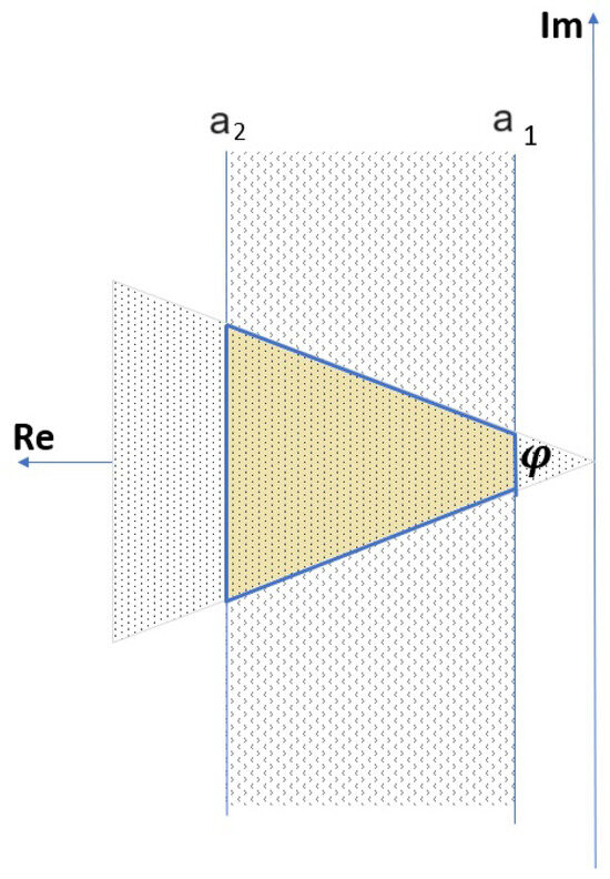 The search for the matrix is called the existence problem [16,37]. The multidimensional LMI controller is described in [29,38]. In a simplified manner, the condition for the search for the stability of the system considering the pole position areas in the left half-plane of the composite variables will be presented below. During the synthesis of the controller, the area of the vertical chord and the cone of the dilation angle were chosen, where the vertical chords were placed on the axis of the composite variables . This is how the region of the sector with a dilation angle of was obtained, assuming that , then the condition is:
