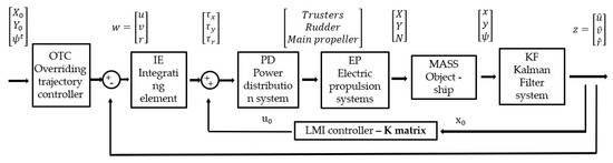 According to the principle presented in [23], the set signals on the rudder devices, such as main propulsion or thrusters, are fed into the block modeling the dynamics of the individual devices, i.e., the rudder blade, main propulsion, and thrusters, hereinafter referred to as the allocation system. It should be noted that the reference signals are components of the input signal vectors for the blocks where the forces and moments occurring on the right-hand side of the Equations (1)–(3) are calculated. In the presented scheme, the components of the output vectors from the hull dynamic block and the ship kinematics model are the values of the three ship velocities, such as:
