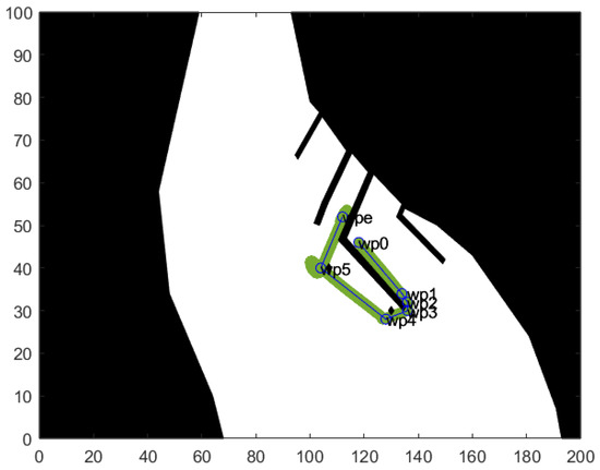 Scenario I—blue represents the trajectory set by the ACO, green represents the trajectory made by the vessel based on LMI control. In addition, start points wp0 and end points wpe are marked by six points.