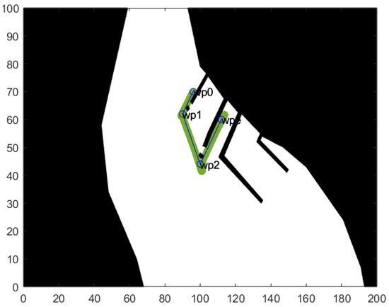 In the process of planning a ship’s safe trajectory, an optimization algorithm calculates the safe trajectory P from the current position of the ship () to the defined final position (), as defined by Equation (10). Every waypoint is defined using the coordinates of the ship’s position (x and y) and the ship’s course . Algorithm 2 shows a pseudocode for the procedure applied to the algorithm for building a graph representing possible waypoints of the ship’s path.