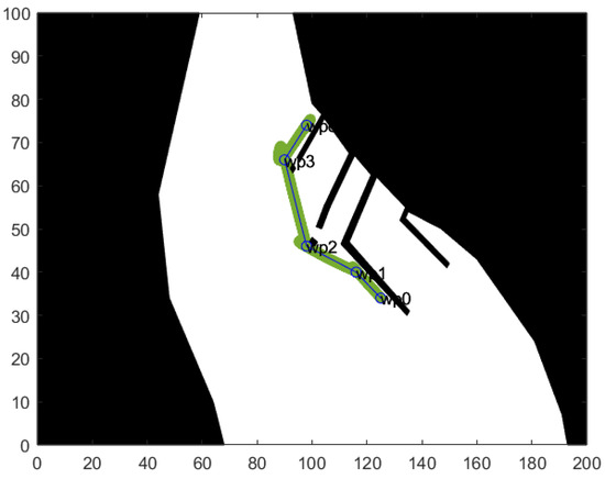 As can be seen in Figure 6, Figure 7 and Figure 8, the three scenarios differ in the initial waypoint of the path, marked as . Every scenario also differs in the details concerning the navigational environment. The difference lies in the placement of small rectangular obstacles, which model buoys. For every scenario they are placed differently in order to ensure a proper safe distance of the vessel from the quay during maneuvering. The assumed initial and final waypoints and the placement of the buoys influence the complexity and effectiveness of the algorithm. In all scenarios, the algorithm was able to calculate a safe, optimized path.