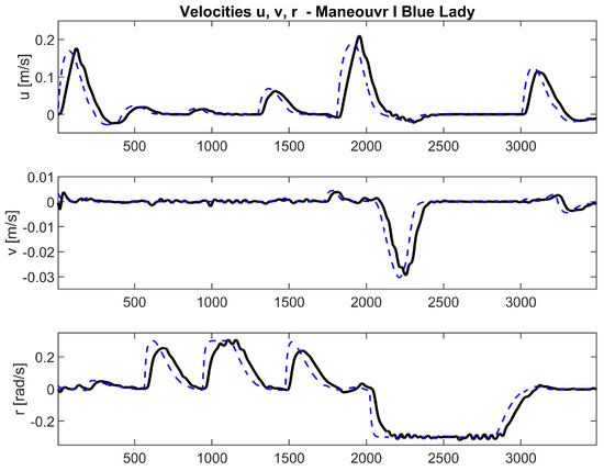 where m represents ship mass, represents the longitudinal component of velocity, r represents the rotational component of velocity, v represents the lateral component of velocity, represents the mass moment of inertia, and the forces , and moments represent the hydrodynamics and the main propulsion system, the rudder blade, and the individual propellers of the vessel. With the above assumptions, a block diagram of the mathematical simulation model of the training vessel the Blue Lady was determined and is shown in Figure 2.