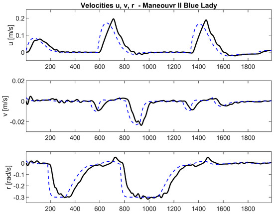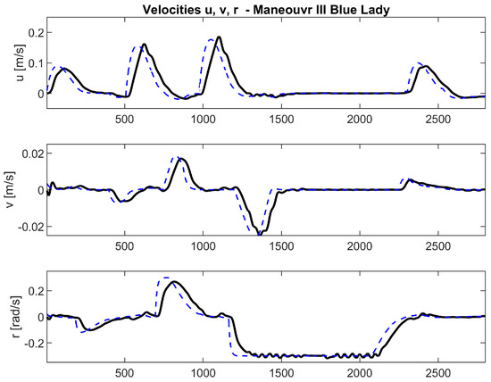 The synthesis of the controller with the support of LMI tools proves that it is possible to operate a multidimensional controller for several reference signals without taking into account cross-coupling, which was proven by presenting the values of the signals of individual ship speeds. As can be seen in Figure 9, Figure 10 and Figure 11 in the simulations, a small deviation from the setpoint has no effect on the maneuver being performed, which is a promising assumption for carrying out the same simulations in real conditions on Lake Silm in Ilawa. In none of these examples is there any cross-coupling, and the controller is able to cope even with changes in trajectory points. For example, in Figure 9, three velocity values had to be set between 1800 and 2100 s, which did not interfere with the controller and the final maneuver. A similar property can be observed in Figure 10 in the interval between seconds (1300 to 1600) and in Figure 11 in the interval between seconds (1000 to 1500).