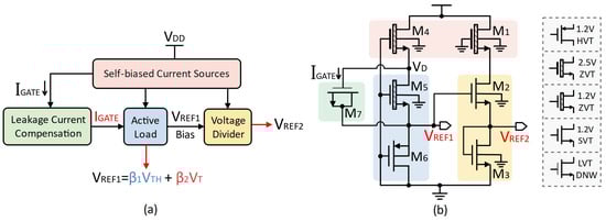 Figure 2a,b separately illustrate the block diagram and schematic of the dual-output voltage reference proposed in this paper. The design includes a leakage current compensation circuit with a trimming block, an active load, two self-biased current sources, and a diode-connected voltage divider.