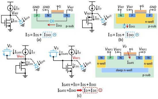 In this paper, a leakage current compensation method based on gate leakage transistors is proposed, as shown in Figure 3c. The current in the gate leakage transistor is critical in this method, including gate-to-channel current (), gate-to-source/drain currents ( and ) and gate-to-substrate current (). It is injected into the diode-connected MOS transistor to offset the current extracted by the parasitic reverse-biased PN junction, thereby equalizing and and enhancing temperature compensation. According to the modeling results of the gate leakage transistor, when its gate applies a certain voltage, it can be seen as a huge resistor with resistance [27]. Consequently, the compensated current can be expressed as: