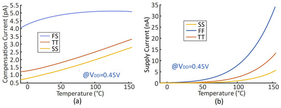 As illustrated in Figure 6a, the compensated gate leakage current exhibits only minimal variation across the temperature range from −10 °C to 155 °C. However, the supply current displays an increasing trend with rising temperature, as depicted in Figure 6b. Specifically, the supply current remains below 81 pA across various process corners at = 0.45 V and −10 °C, escalating to a maximum of 35 nA at 155 °C. At the same time, according to Equation (9), also rises with temperature, reaching approximately 200 pA at 155 °C.